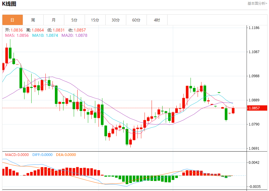 今日周二,截止目前欧元兑美元报1.0857,上涨0.18%。