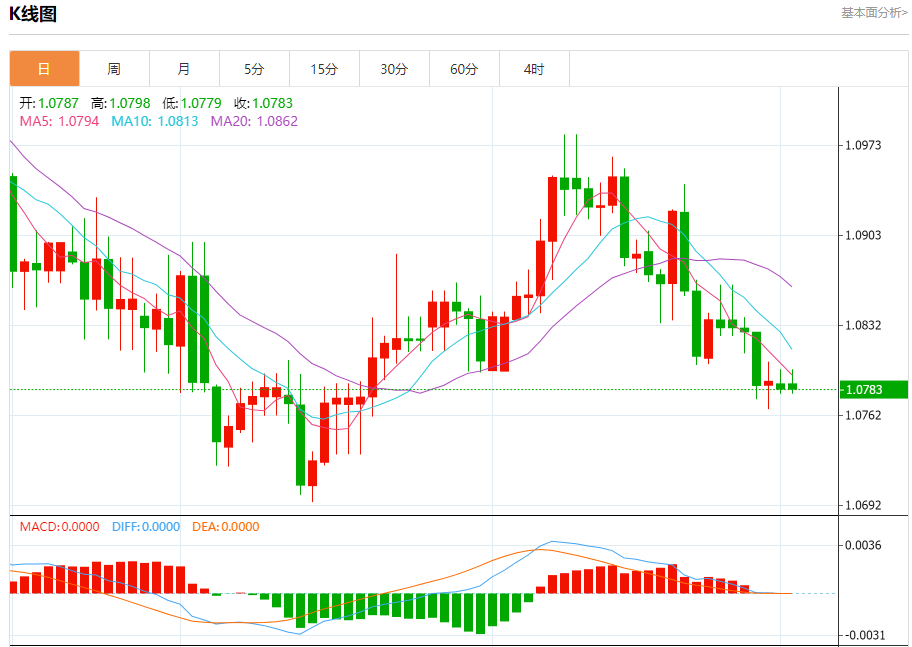 今日周一,截止目前欧元兑美元报1.0787,下跌0.03%。