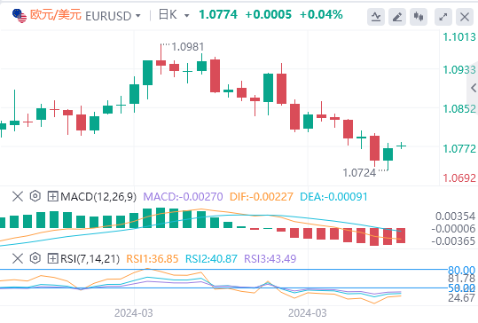 2、德国统计局Destatis周二发布报告称,德国3月份通胀放缓幅度略高于预期,为近三年来最低水平。3月份德国消费者物价调和指数初值月率上升0.6%,略低于预期0.7%。德国消费者物价调和指数初值年率2.3%,低于期值2.4%。通胀走软表明德国正接近欧洲央行(ECB)设定的2%的目标,提高了市场对欧央行将降息的希望。这因此又打压欧元,给欧元/美元货币对带来逆风。