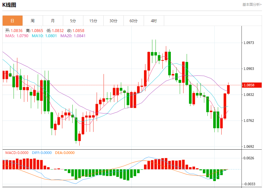 今日周四,截止目前欧元兑美元报1.0859,上涨0.21%。