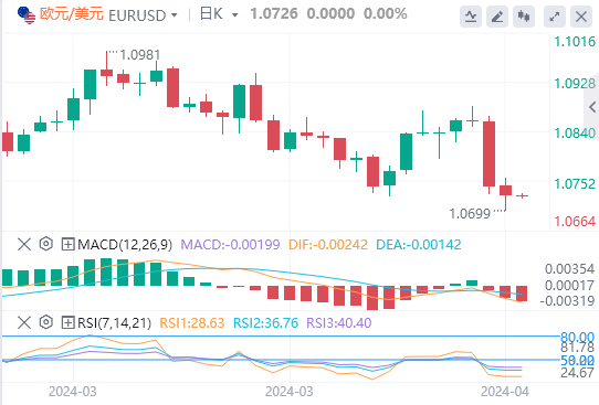 4月12日,周五亚市早盘,欧元/美元交投于1.0728附近交投,走势看跌。市场对美联储9月降息的猜测不断升温,美元小幅回升,对欧元/美元构成压力。周四,欧洲央行(ECB)一如预期将利率维持在纪录高位,并为6月降息敞开了大门。投资者正在等待周五公布的德国3月份通胀数据和美国密歇根消费者信心指数初值。