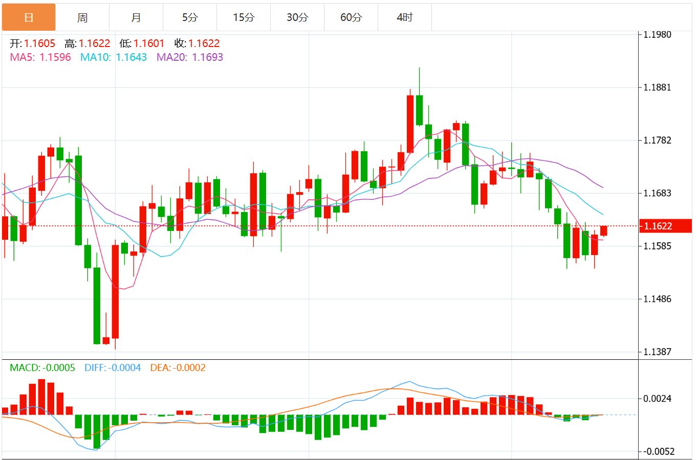 周三亚盘,欧元/美元日内上涨,现报1.1622附近,美元走弱,因中美贸易紧张局势加剧,美国商业信心进一步恶化。