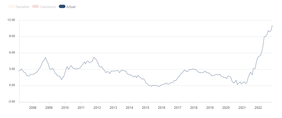 根据英国国家统计局(ONS)的数据,英国10月份的年通货膨胀率飙升至11.1%,创41年来新高,而9月份为10.1%。与此同时,美国10月份消费者价格指数(CPI)同比上涨7.7%,增速低于8.0%的预期,为今年1月以来的最低水平。