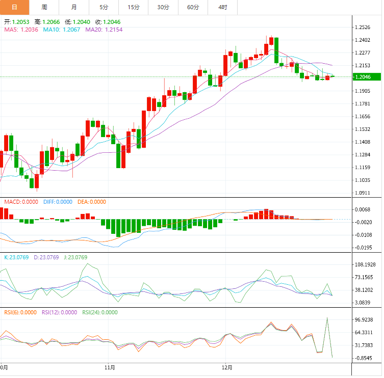 该货币对目前位于20周期指数移动平均线(EMA) 1.2050左右上方,这表明短期上行趋势仍然稳固。