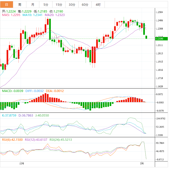 周五盘中,英镑兑美元下跌至1.2193,跌幅0.27%。