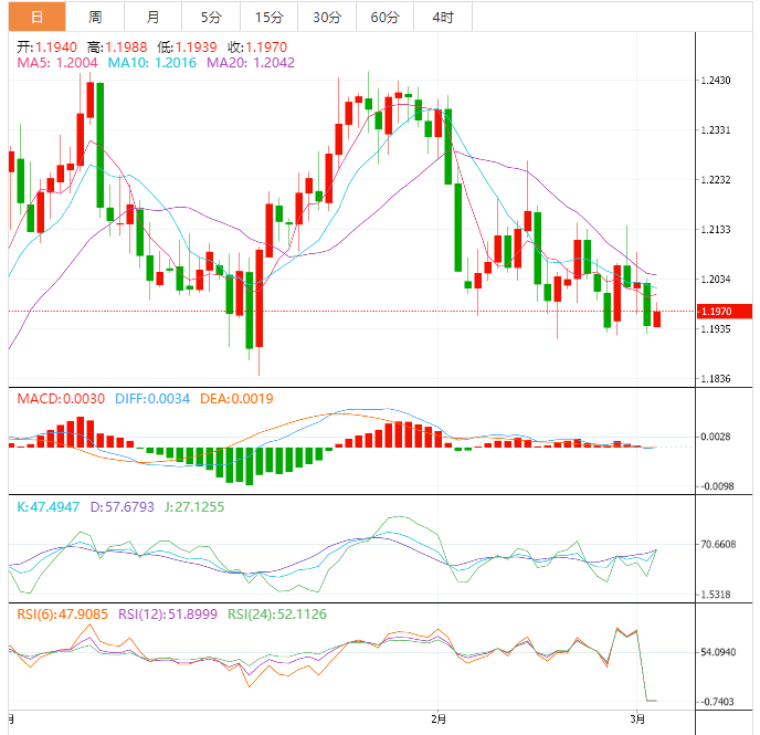 周五盘中,英镑兑美元上涨至1.1971,涨幅0.23%。