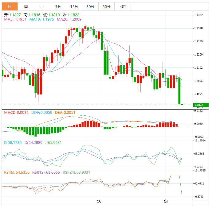 周三盘中,英镑兑美元下跌至1.1824,跌幅0.03%。