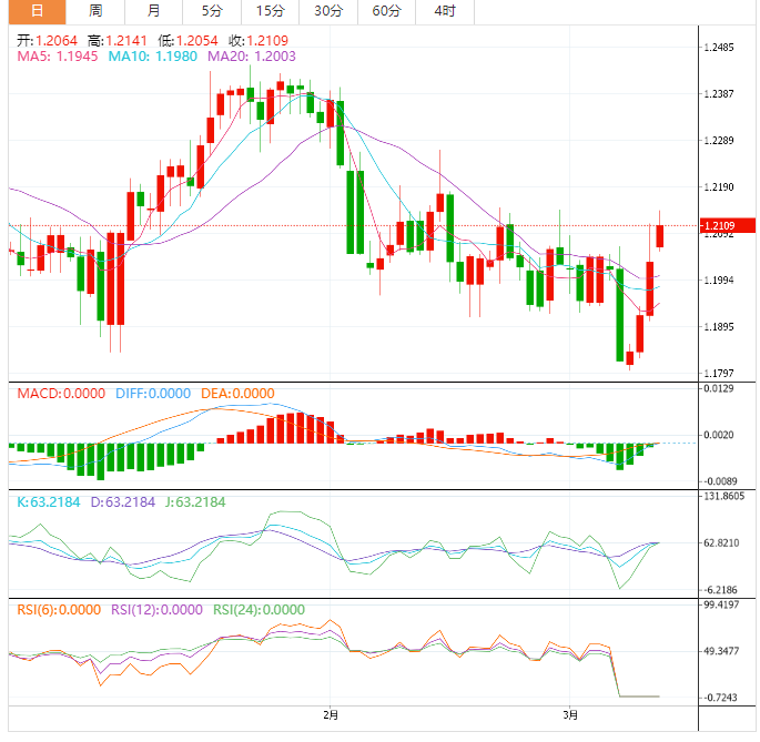 周一盘中,英镑兑美元上涨至1.2110,涨幅0.63%。