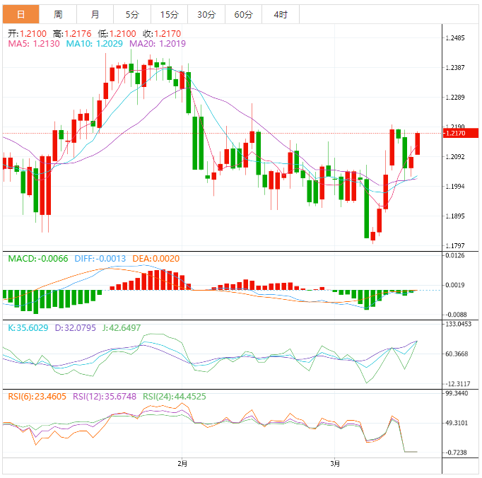 周五盘中,英镑兑美元上涨至1.2171,涨幅0.65%。
