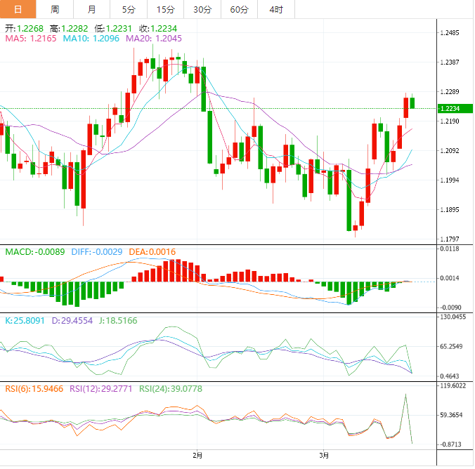 周二盘中,英镑兑美元下跌至1.2234,跌幅0.29%。