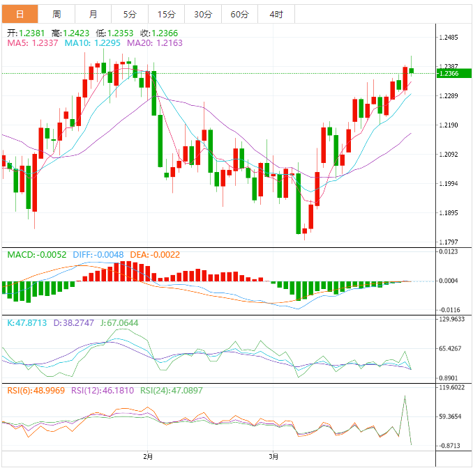 周五盘中,英镑兑美元下跌至1.2369,跌幅0.15%。