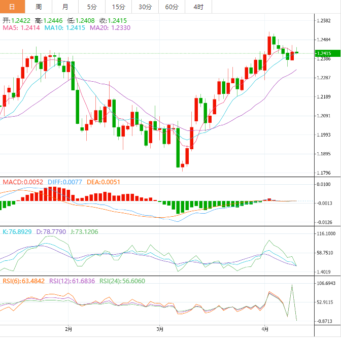 周三盘中,英镑兑美元下跌至1.2417,跌幅0.04%。