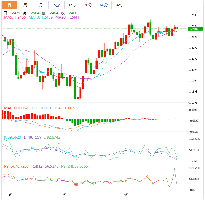 周五盘中,英镑兑美元下跌至1.2466,跌幅0.09%。