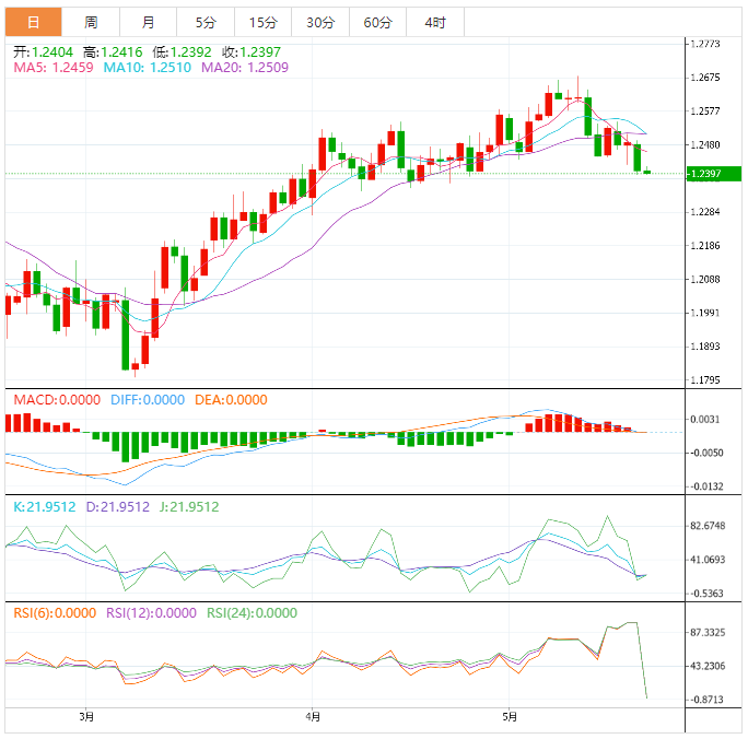 英镑兑美元已经在四小时内形成了头肩图形态。H&S图表模式的突破表明看跌反转。H&S模式的领口位于4月27日的低点1.2436。早些时候,英镑在跌破从03年4月低点1.2275绘制的向上倾斜的趋势线后失去了吸引力。