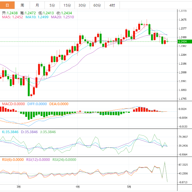 周一盘中,英镑兑美元下跌至1.2435,跌幅0.09%。