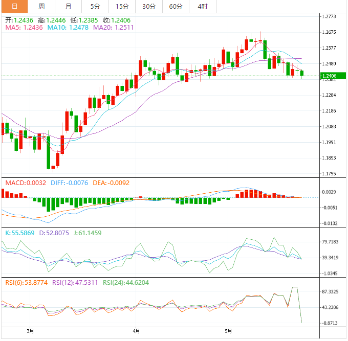 周二盘中,英镑兑美元下跌至1.2406,跌幅0.25%。