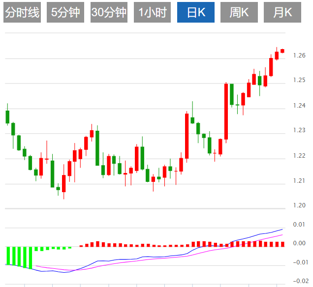 英镑兑美元周一触及 1.2644 水平,触及 9 月初以来的最高水平。周二亚市,英镑兑美元维持上行趋势,交投于 1.2630 附近。英镑兑美元第四天走强,反映出英国经济在英国央行(BOE)採取紧缩措施的情况下依然保持弹性。