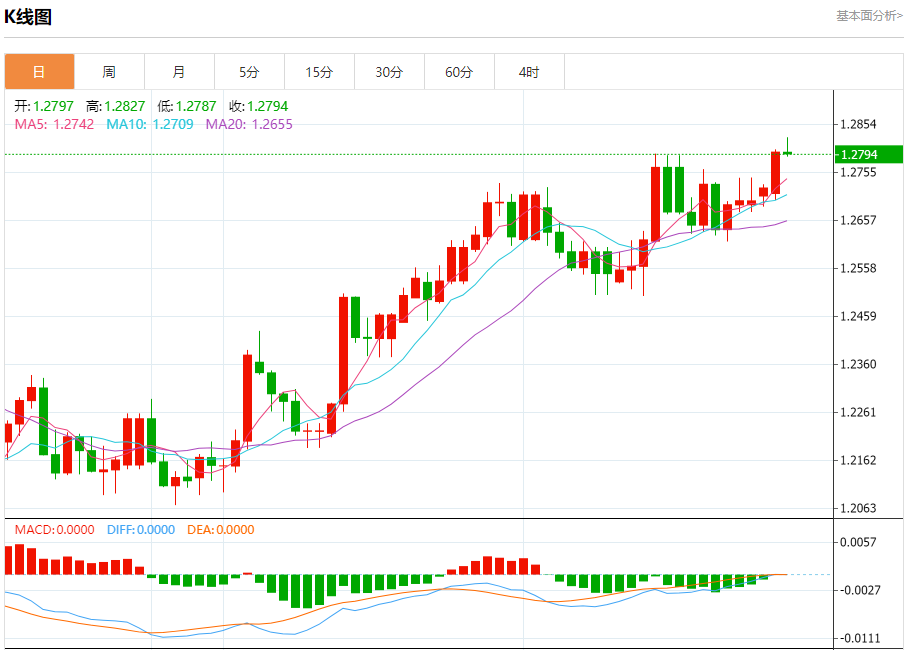 周四欧市盘中,英镑兑美元交投于1.2795,跌幅为0.03%。