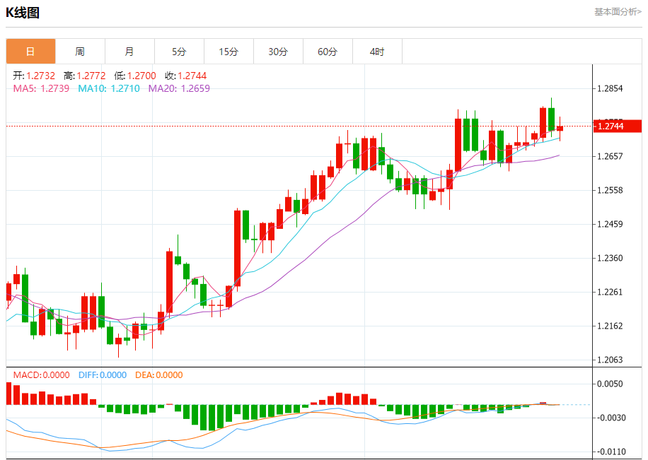 周五欧市盘中,英镑兑美元交投于1.2745,涨幅为0.09%。