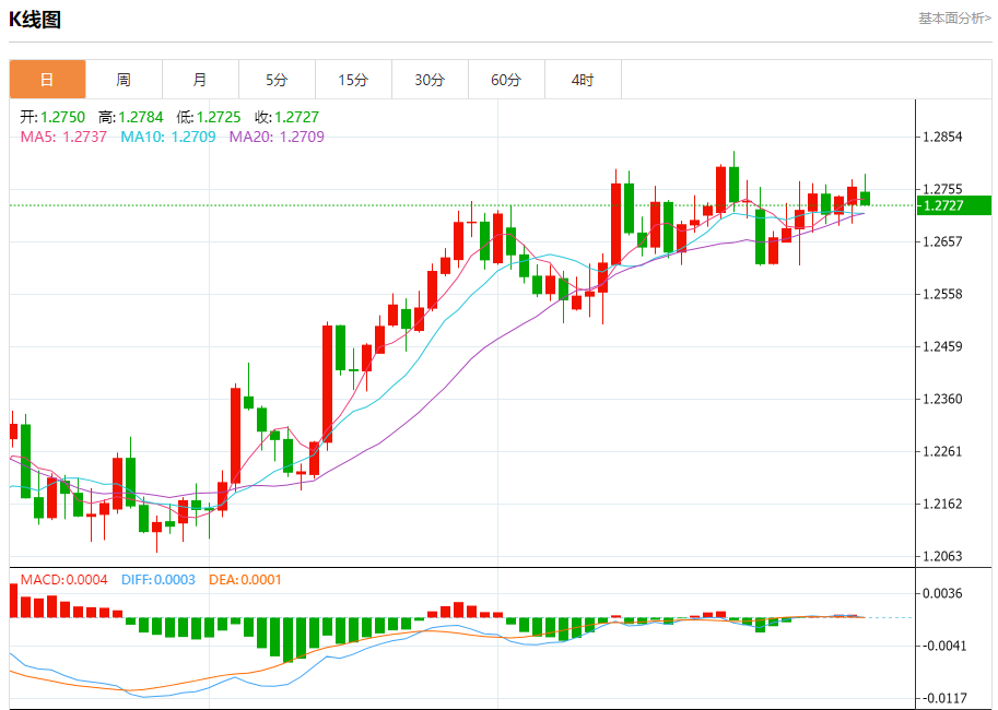 周五欧市盘中,英镑兑美元交投于1.2727,跌幅为0.26%。