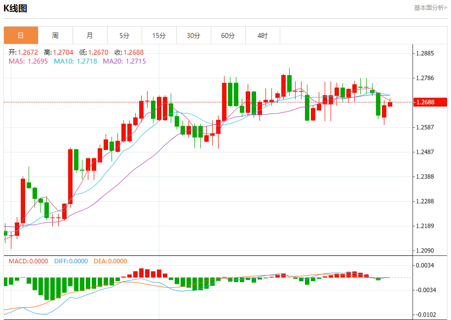 周四欧市盘中,英镑兑美元交投于1.2686,涨幅为0.07%。