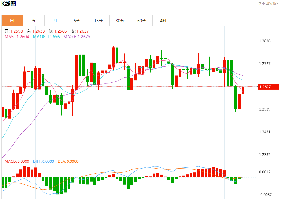 周三欧市盘中,英镑兑美元交投于1.2628,涨幅为0.23%。