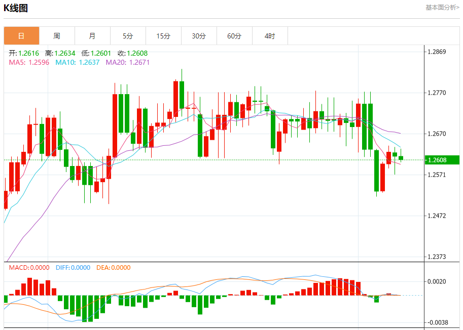 周五欧市盘中,英镑兑美元交投于1.2609,跌幅为0.06%。