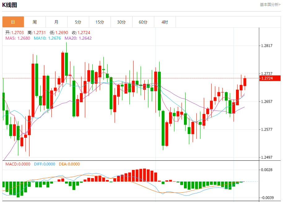 周三欧市盘中,英镑兑美元交投于1.2725,涨幅为0.15%。