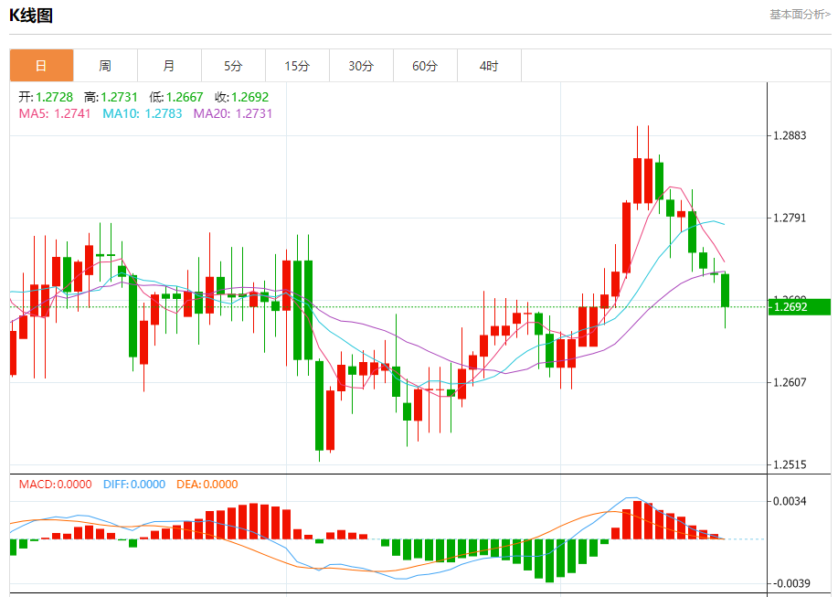 周二欧市盘中,英镑兑美元交投于1.2693,跌幅为0.28%。