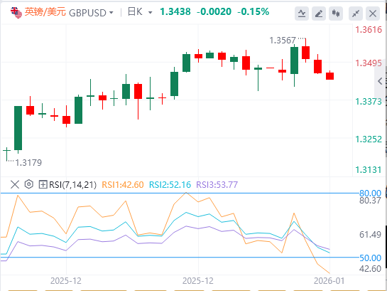 从1.3791高点测得到1.3008低点,61.8%的斐波那契回撤1.3491限制了即时上涨空间。若突破该水平,反弹将延伸至78.6%的斐波那契回撤位1.3623。相反,若收盘价跌破20日均线1.3443,将阻碍上涨,可能进一步回撤至12月17日低点及38.2%斐波那契回撤点1.3310附近。