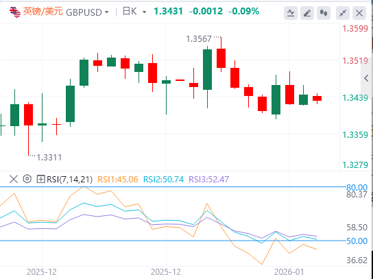 技术面上,英镑/美元略微下跌,写本文时交易价约1.3420。动量指标14日相对强弱指数(RSI)在从超买读数回落后,处于50(中性),表明动能平衡。当前阻力位位于九日均线1.3444。如果日收盘价回升至短期均线之上,可能为冲击三个月高点1.3562打开路径。主要支撑位于50日均线1.3387。若日收盘低于中期均线,将为该货币对打开通往1.3010八个月低点附近区域的大门。