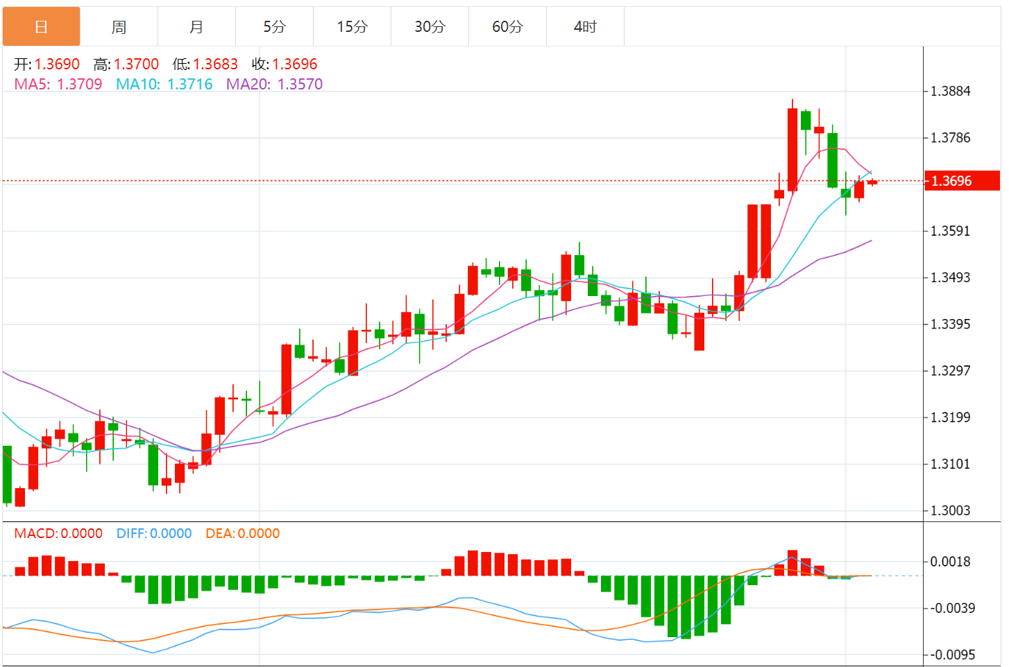 从多年来的高点回落的近期支撑位在1.3650附近,买家在回调时介入。 即时阻力位在心理关口1.3700,随后是最近的波动高点1.3869。 若持续突破1.3870,将为向1.3900甚至1.4000的走势打开大门。