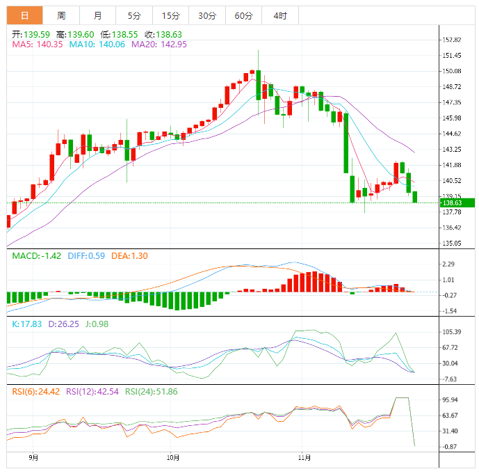 周四盘中,美元兑日元下跌至138.63,跌幅0.68%。