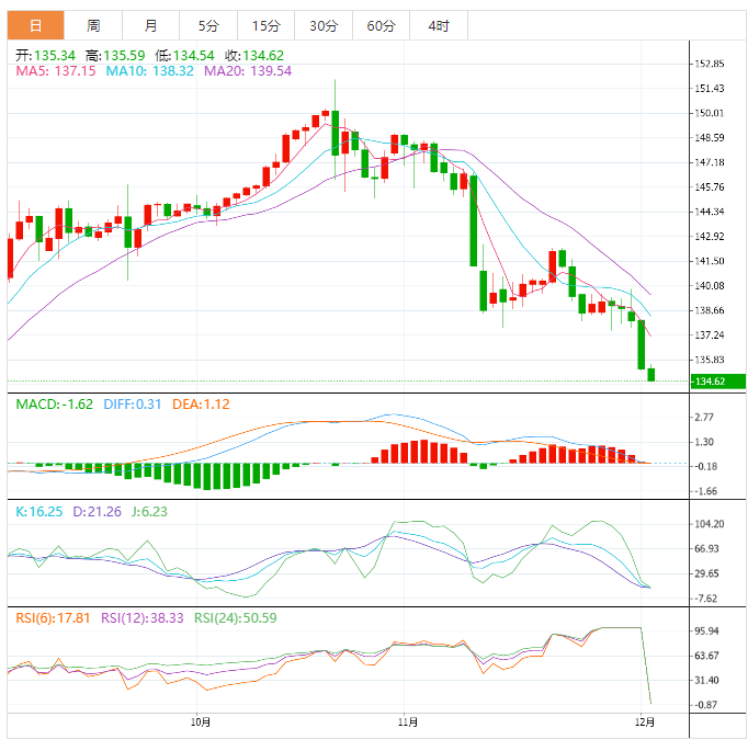 今天的预期交易区间在134.00支撑位和136.00阻力位之间。