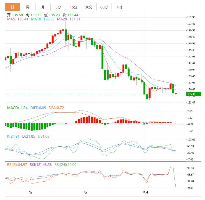 今天的预期交易区间在134.50支撑位和136.30阻力位之间。