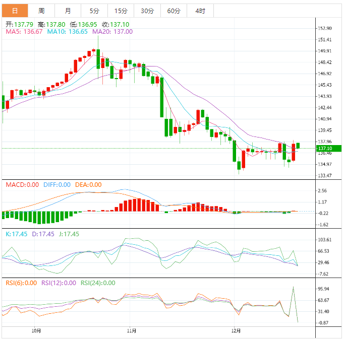 周五盘中,美元兑日元下跌至137.11,跌幅0.50%。