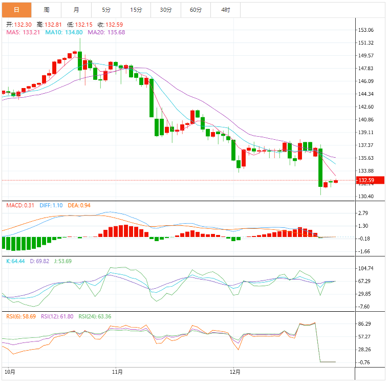 今天的预期交易区间在131.60支撑位和133.40阻力位之间。