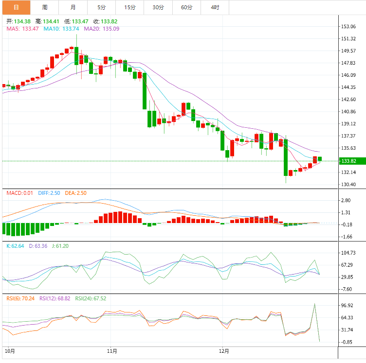 今天的预期交易区间在133.10支撑位和135.00阻力位之间。