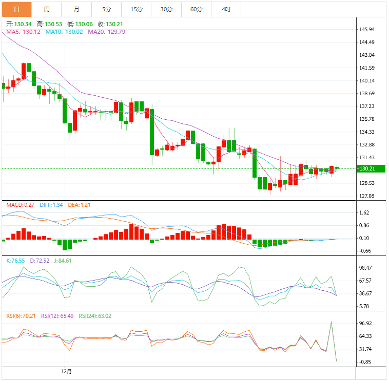周二盘中,美元兑日元下跌至130.24,跌幅0.08%。