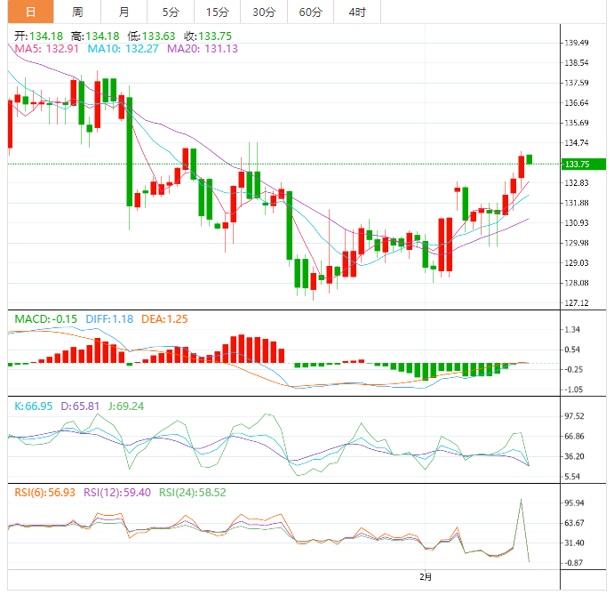 今天的预期交易区间在133.00支撑位和134.80阻力位之间。
