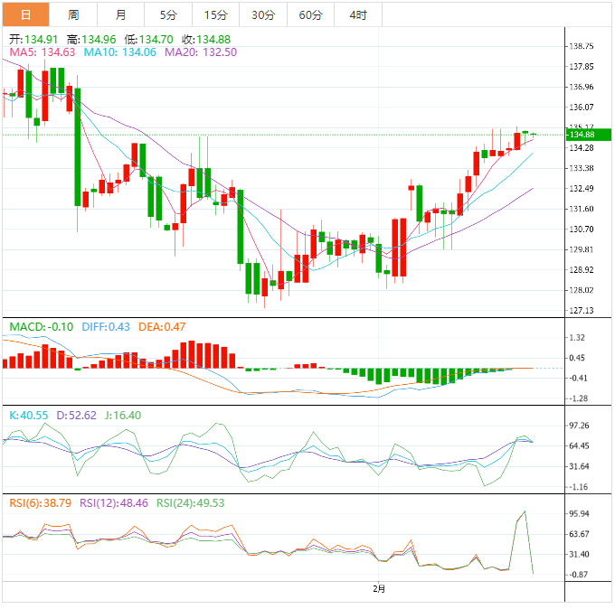 今天的预期交易区间在134.00支撑位和135.70阻力位之间。