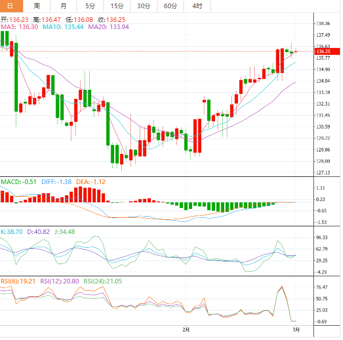周三盘中,美元兑日元上涨至136.25,涨幅0.01%。