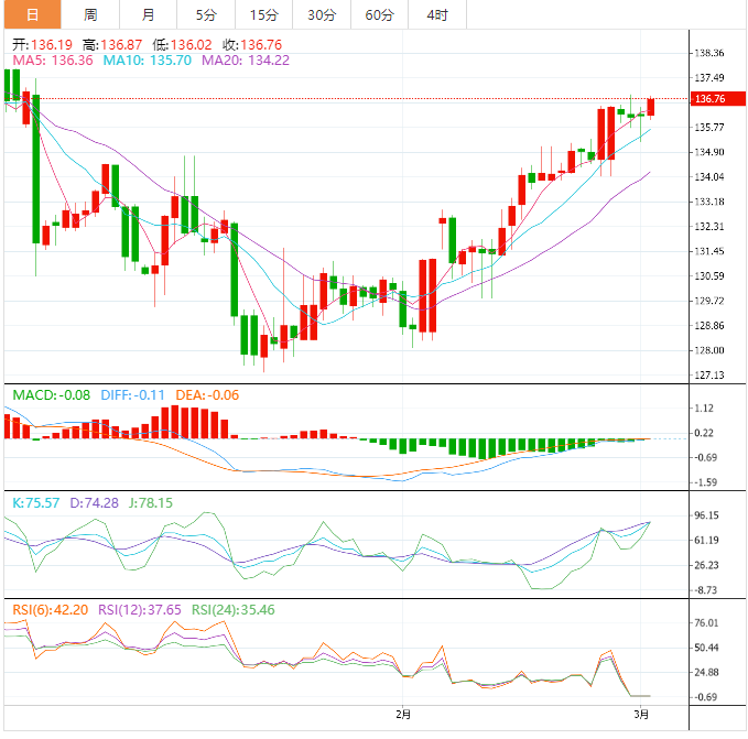 今天的预期交易区间在135.50支撑位和137.30阻力位之间