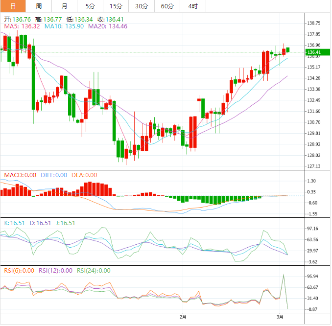 周五盘中,美元兑日元下跌至136.42,跌幅0.26%。