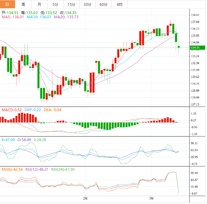 周一盘中,美元兑日元下跌至134.36,跌幅0.52%。