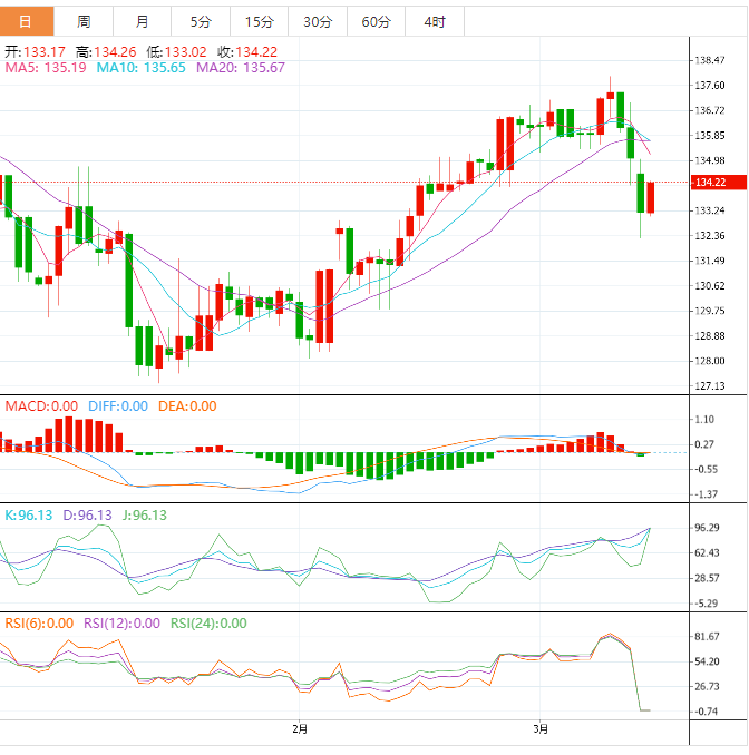 周二盘中,美元兑日元上涨至134.24,涨幅0.77%。