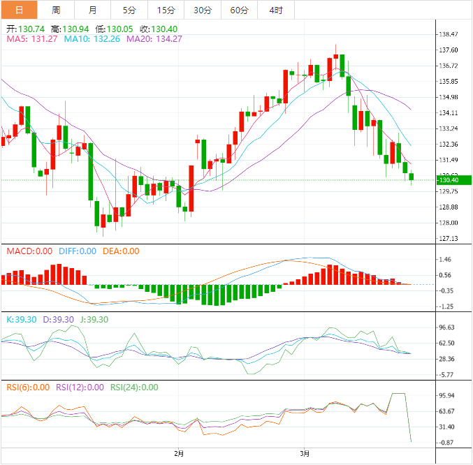 周五盘中,美元兑日元下跌至130.41,跌幅0.29%。