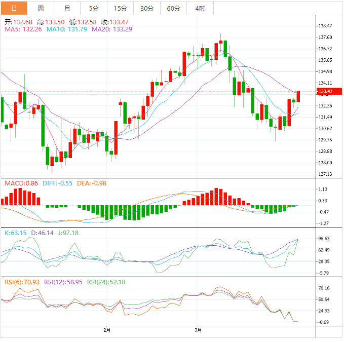 周五盘中,美元兑日元上涨至133.48,涨幅0.63%。