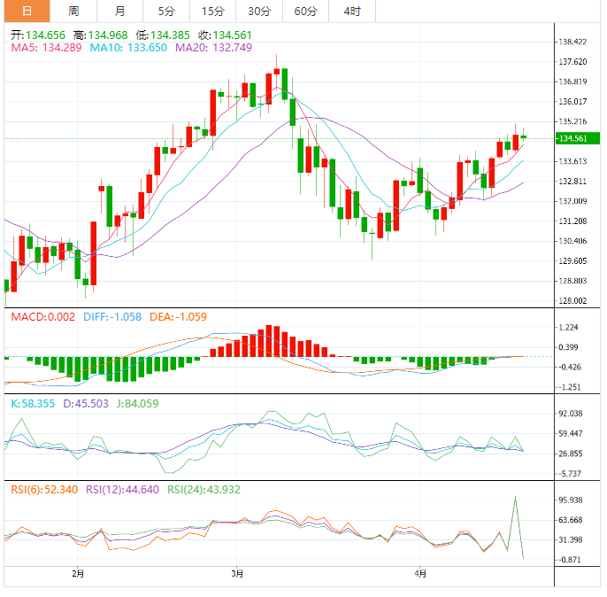 预计今天的交易区间在支撑位134.00和阻力位135.70之间。