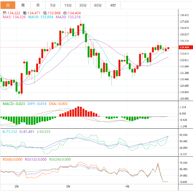 预计今天的交易区间在133.70支撑位和135.30阻力位之间。